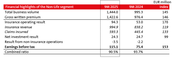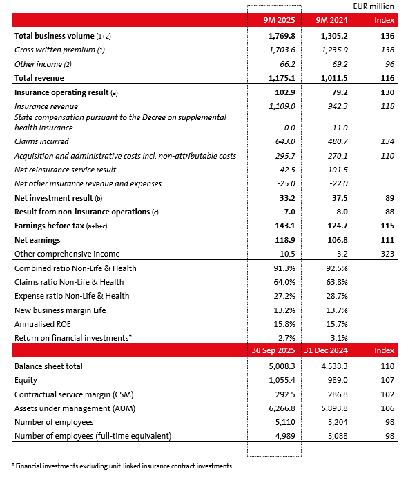 Other comprehensive income totalled EUR 10.5 million (9M 2024: EUR 3.2 million), an increase driven by the lower impact of interest rate changes on the valuation of investments and also by the appropriate matching of asset and liability duration. The Group's capitalisation at the end of the first nine months was within the target range of 200–250%.