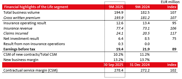 Earnings before tax of the Life segment amounted to EUR 19.4 million, compared to EUR 21.9 million last year. The year-on-year comparison is influenced by this year's upgrade of the annuity insurance methodology, which, among others, provides a more prudent projection of their cash flows.