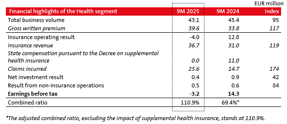 Following last year's restructuring of the segment's business model, the Group continued activities this year aimed at growing and developing complementary health insurance both in Slovenia and in other regional markets. The Group expects the Health segment's result to remain volatile in the coming period, as the segment is in a phase of strong growth but still has a relatively low business volume.