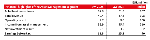 Earnings before tax amounted to EUR 11.8 million (down 10% year-on-year), influenced by a 10% increase in income from asset management (income from fees), which totalled EUR 38.9 million. The net investment result amounted to EUR 2.1 million, 38% lower year-on-year, due to a decrease in the value of equity investments from the segment's own funds.
