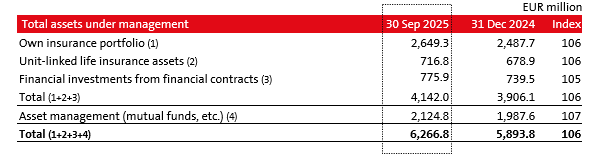 The Group's total assets under management remained broadly unchanged in composition compared to 31 December 2024. Their volume, however, increased by 6% to EUR 6.3 billion. In volatile financial market conditions, the Group achieved a 2.7% rate of return on investments (9M 2024: 3.1%), excluding unit-linked insurance assets. This year's rate of return is largely comparable to last year's, excluding the effect of exchange rate differences on investments, which are offset by changes in insurance provisions, and the impact of business growth in the Italian market on the value of financial investments.