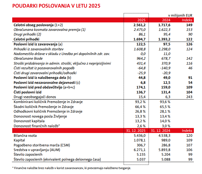 - Skupina Triglav je v letu 2025 dosegla zelo dobre rezultate - poslovni izid pred obdavčitvijo je povečala za 9 odstotkov, na 174,1 milijona evrov, čisti poslovni izid pa za 4 odstotke, na 136,7 milijona evrov.